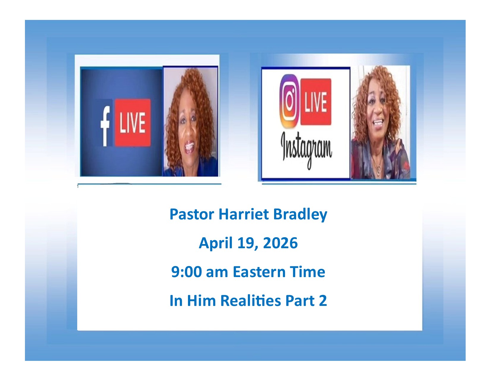 Join Rev. Harriet Bradley every Sunday morning for Facebook Live. You will get a 30 minute power packed Word from the Lord on various topics!!